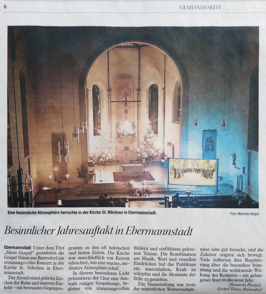 Silent Gospel Konzerte Januar 2026 Von MasterOfTheUniverse2020 | Januar 28, 2026 - 09:55 |Januar 31, 2026 Uncategorized Silent Gospel Konzert in St. Nikolaus, Ebermannstadt Quelle: Fränkischer Tag 26.01.2026 Speichere in deinen Favoriten diesen Permalink.